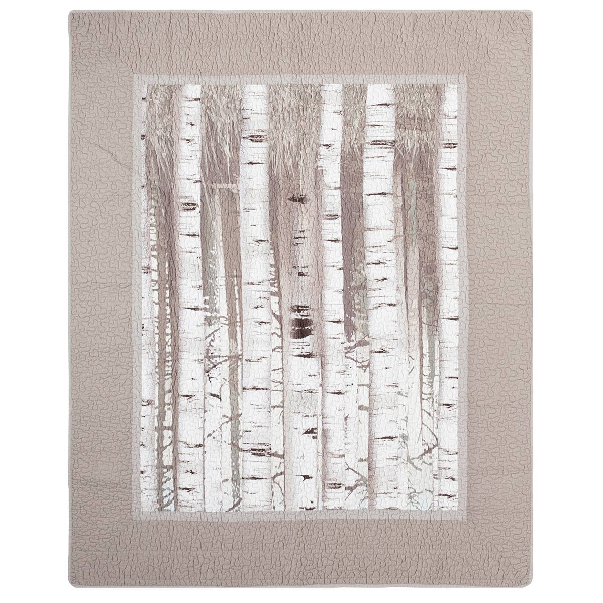 This striking and elegant, outdoor-inspired 100% cotton throw is based on the ever-popular white birch tree. Realistic trees are displayed in a forest scene with a gentle blue and yellow sky peeking through.