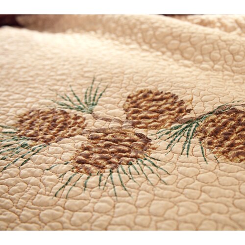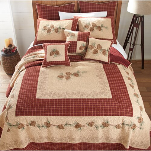 This Donna Sharp Pine Lodge cotton quilt 3 piece set is rustically handsome and both primitive and tailored at the same time. There is rich brick red and camel plaid borders that form frames around beautifully printed pine cones accented by highly-detailed pine motif quilting. It is crafted using dense, thick cotton for strength and durability. This set includes 1 quilt and matching sham(s). It is pre-washed to prevent shrinking. 100% Cotton. Machine wash.