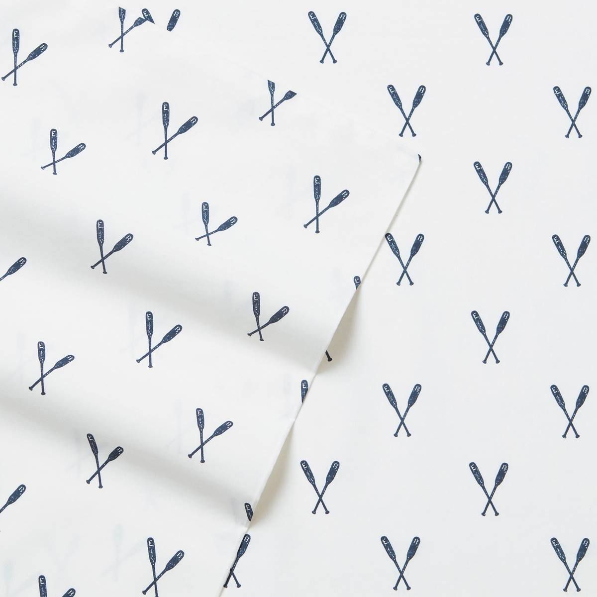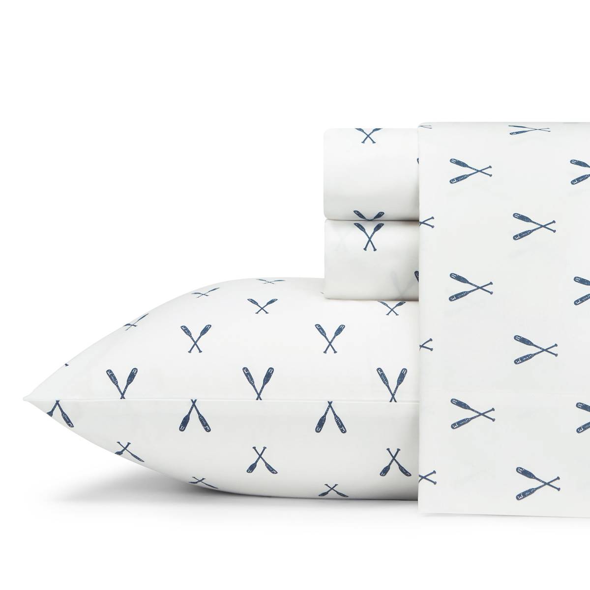 The Eddie Bauer Eddies Oar sheet set offers durability and comfort. The sheet set has printed oar on a white background and is made of cotton with a 200 thread count for superior softness.