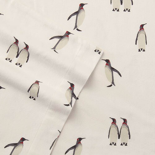 This Eddie Bauer Rookeries sheet set features whimsical penguins on 100% cotton flannel. Threat count: 160. Machine wash, cold. Do not bleach. Tumble dry, gentle on low heat. Iron on low.