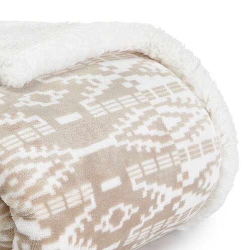 The Eddie Bauer Newcastle throw features a richly textured pattern on this printed fleece throw that is reminiscent of Native American blankets. The throw reverses to a natural white, plush Sherpa fleece for added comfort and warmth. A signature Eddie Bauer logo patch is appliqued to the corner of the face print.