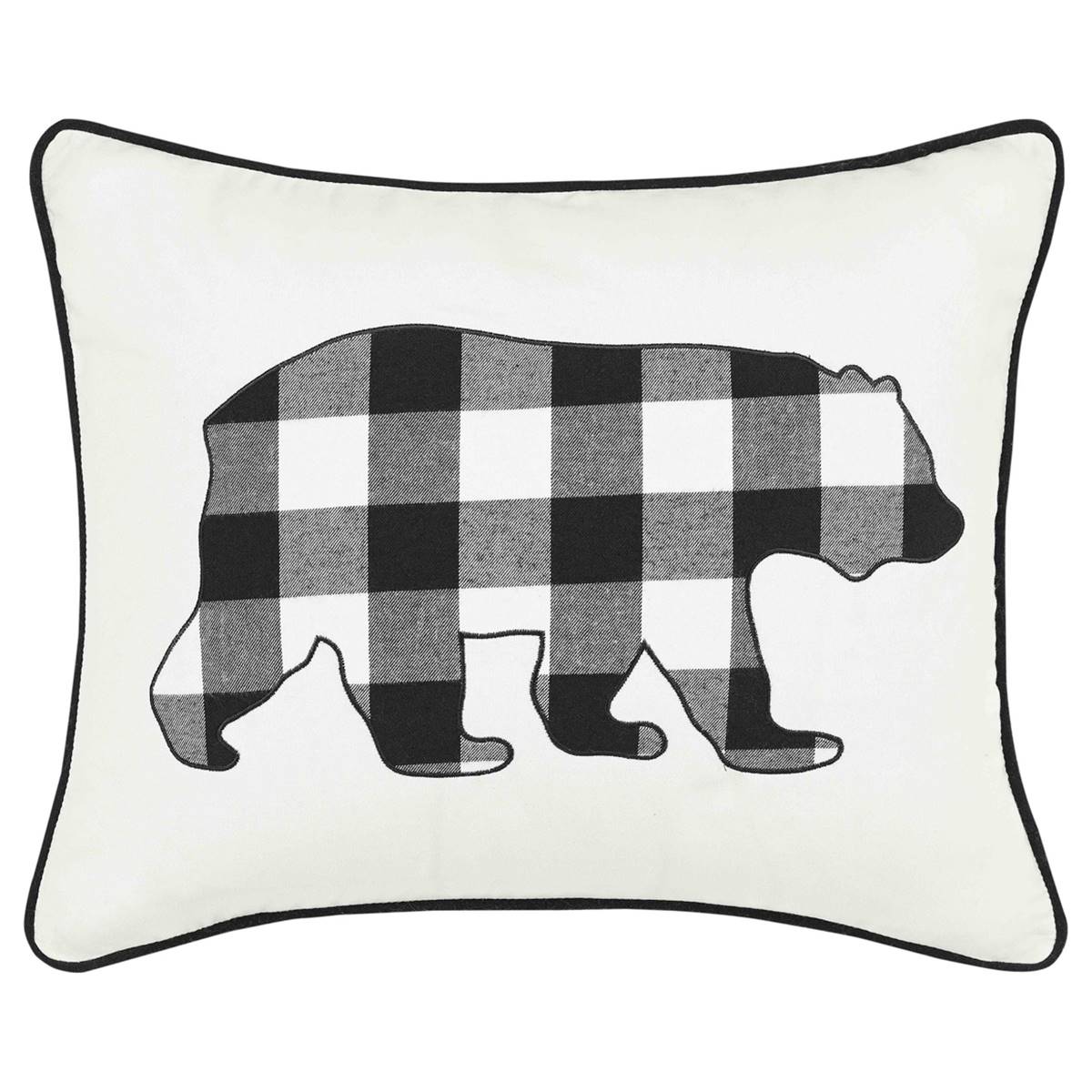 The Eddie Bauer Cabin Plaid Bear breakfast pillow features a large black and white plaid bear printed in the center of the off-white background. This bold all-cotton pillow is soft and will look great on any couch or bed and adds a touch of style to any room.