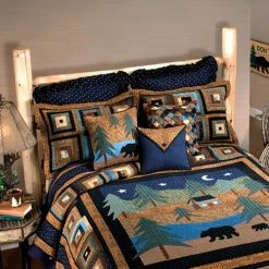 This Donna Sharp Midnight Bear cotton quilt set is lodge inspired and has deep blues, greens and brown fabrics crafted on dense, thick cotton for strength and durability. Mama bear and family take a stroll under the night sky on the center panel while the border is a traditional log cabin design in complementary colors. The bears, trees and cabin are hand appliqued and the border is pieced making this heirloom piece perfect to pass down for generations to come. This set includes 1 quilt and matching sham(s). It is pre-washed to prevent shrinking. 100% Cotton. Machine wash.