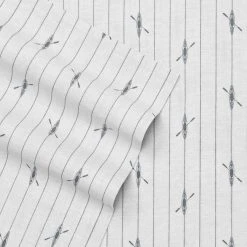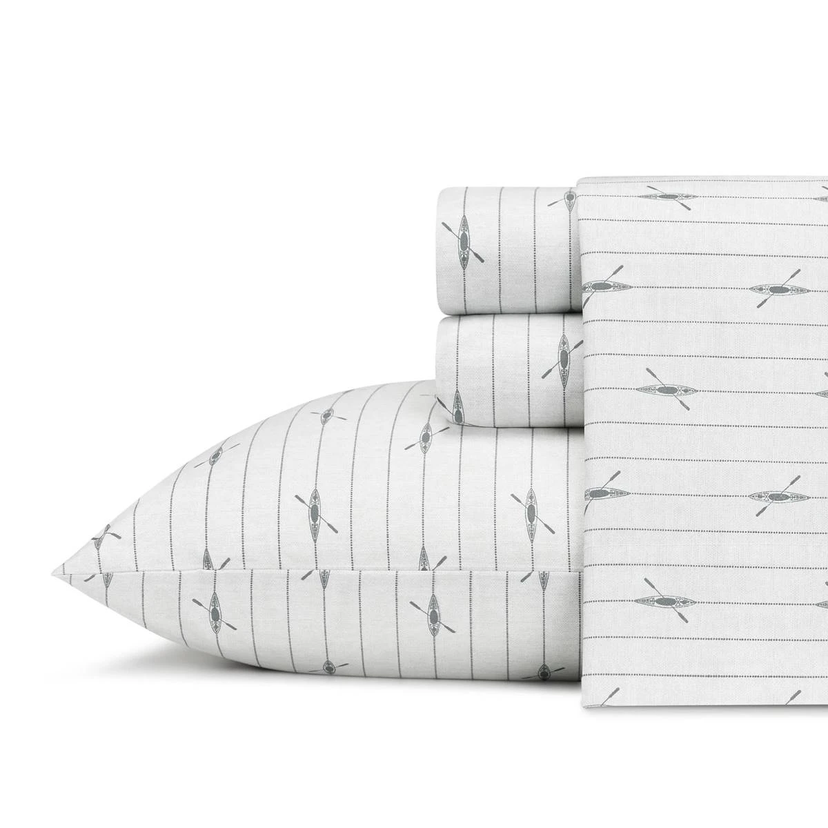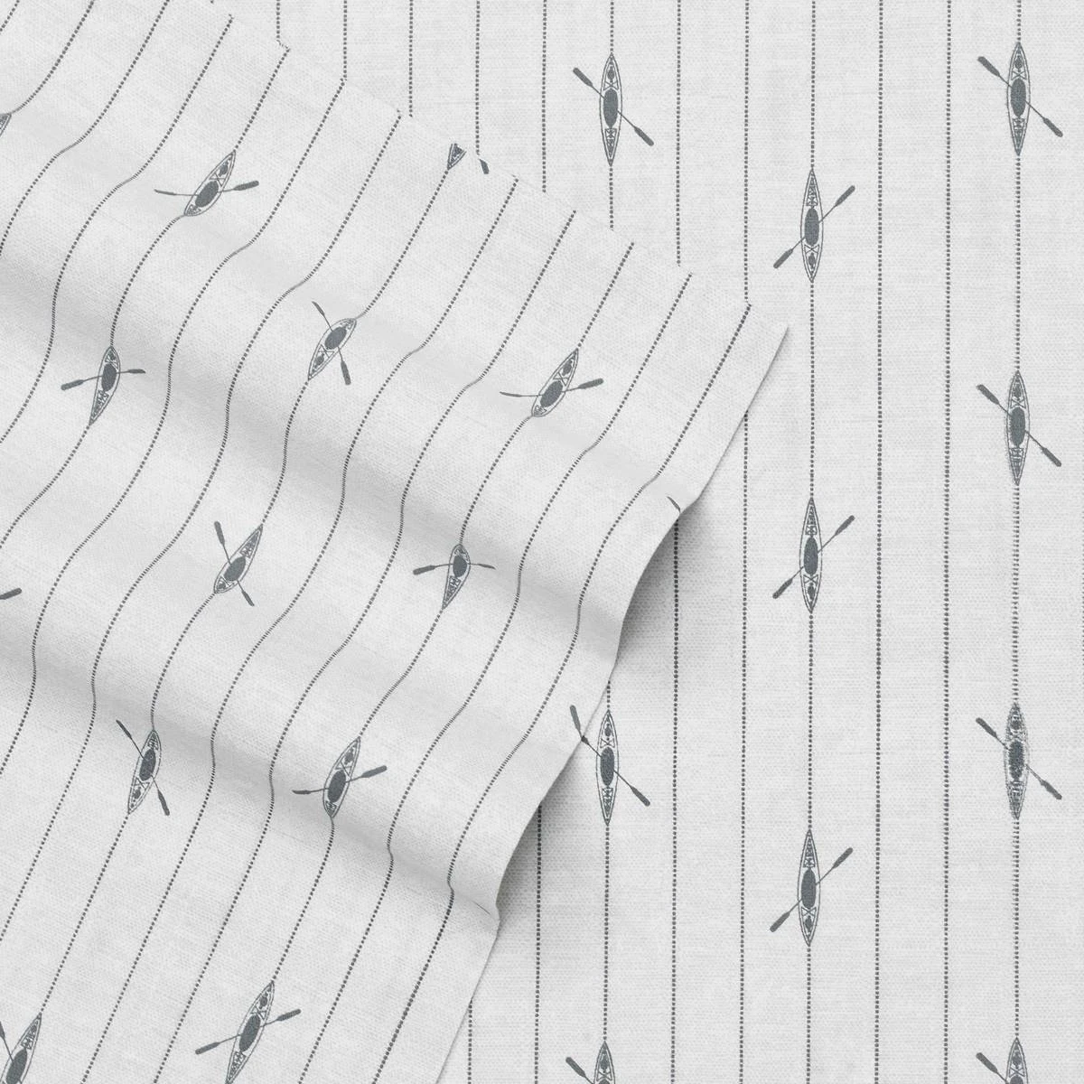 The Eddie Bauer Downstream sheet set offers durability and comfort. The sheet set has printed kayak and stripe design in grey on an ivory background. Sheets are made of cotton with a 200 thread count for superior softness.