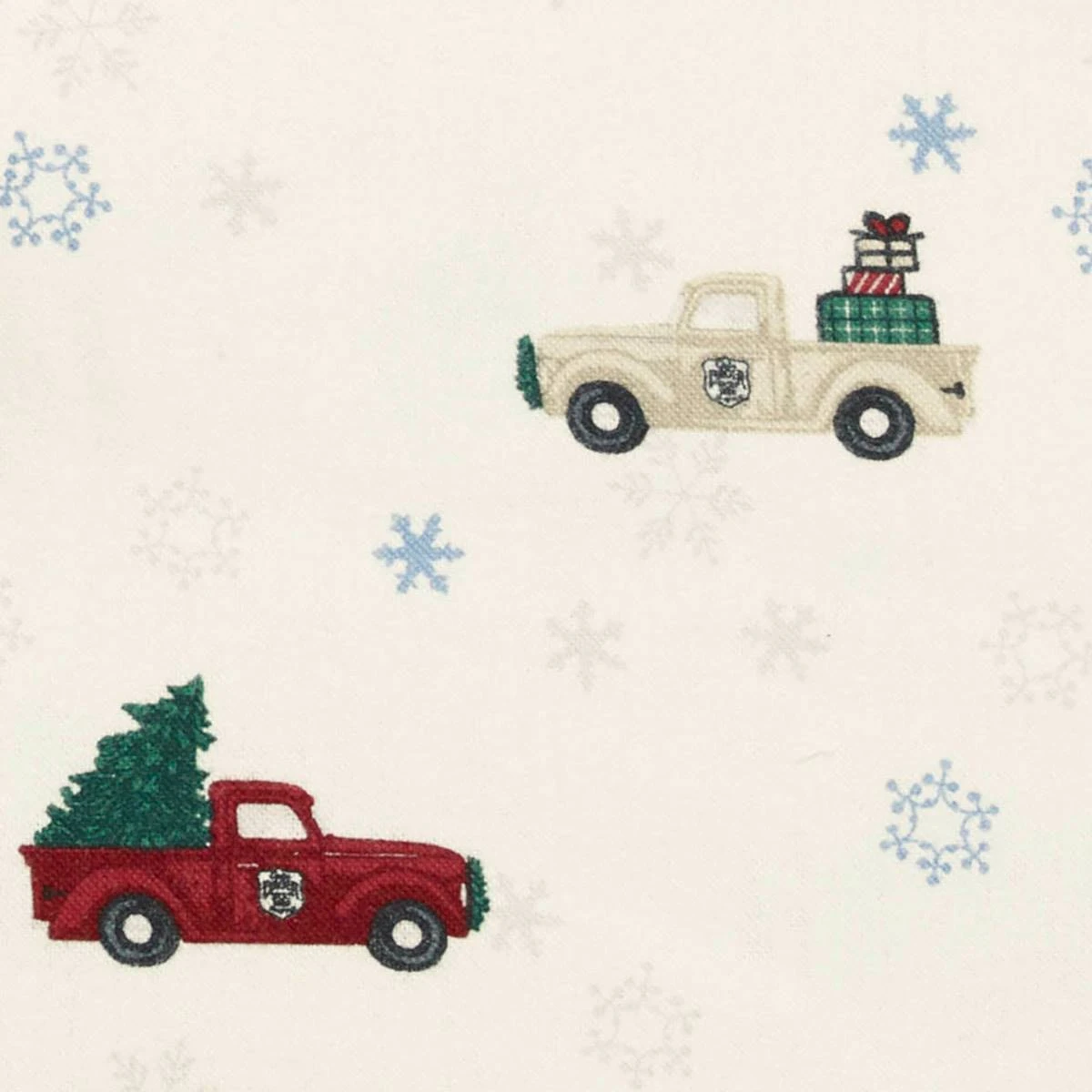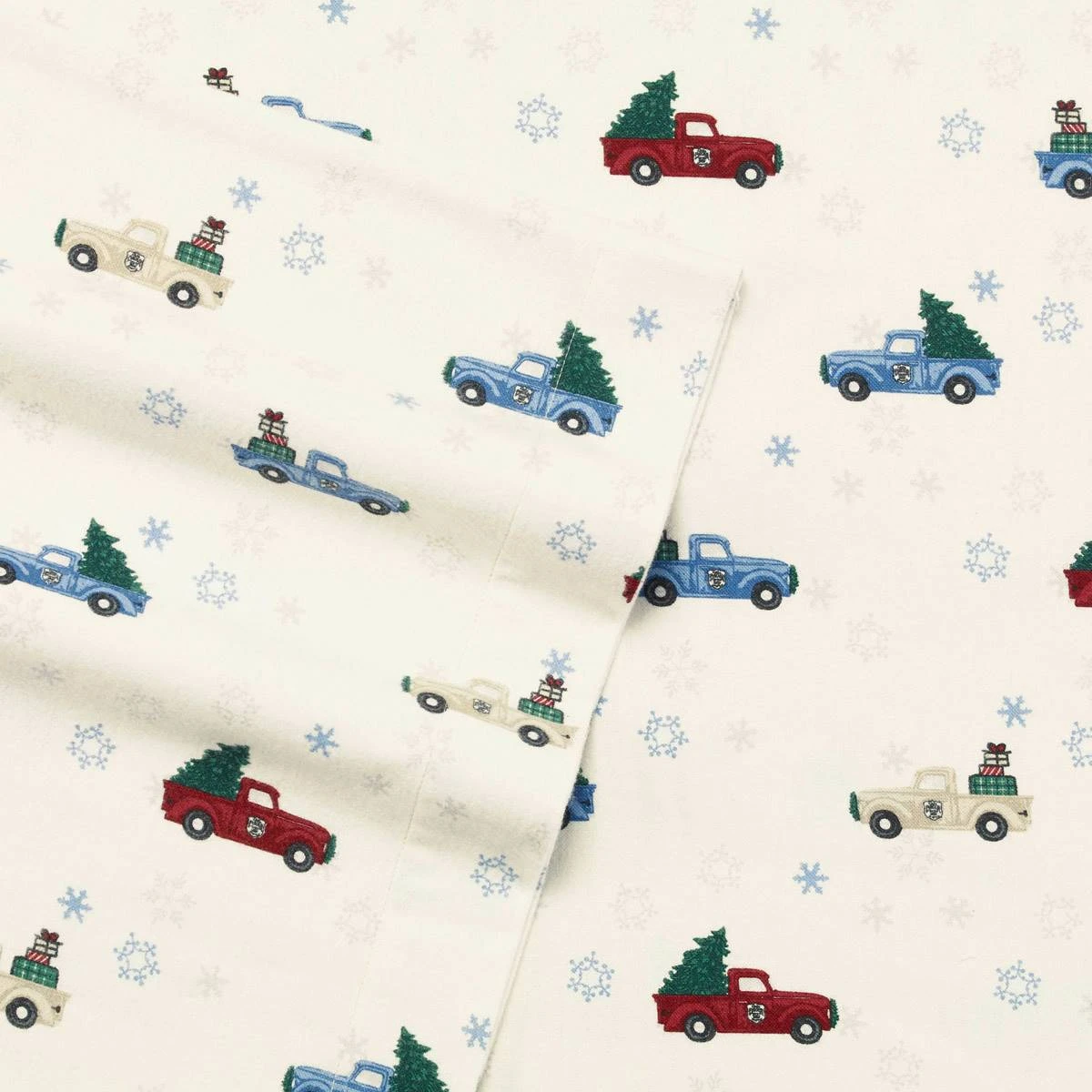 This Eddie Bauer Winter Outing flannel sheet set is the perfect addition to your bedding ensemble. Featuring trucks that are hauling trees and gifts printed on a snowflake background to evoke a beautiful winter aesthetic. The 8-leveled brushing process and woven cotton yarns ensure a comfortable, very soft and cozy finish.
